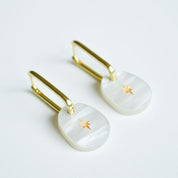 Organic shaped earrings in marbled pearl acrylic, etched with a pretty gold star. Perfect size for everyday wear