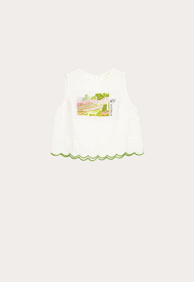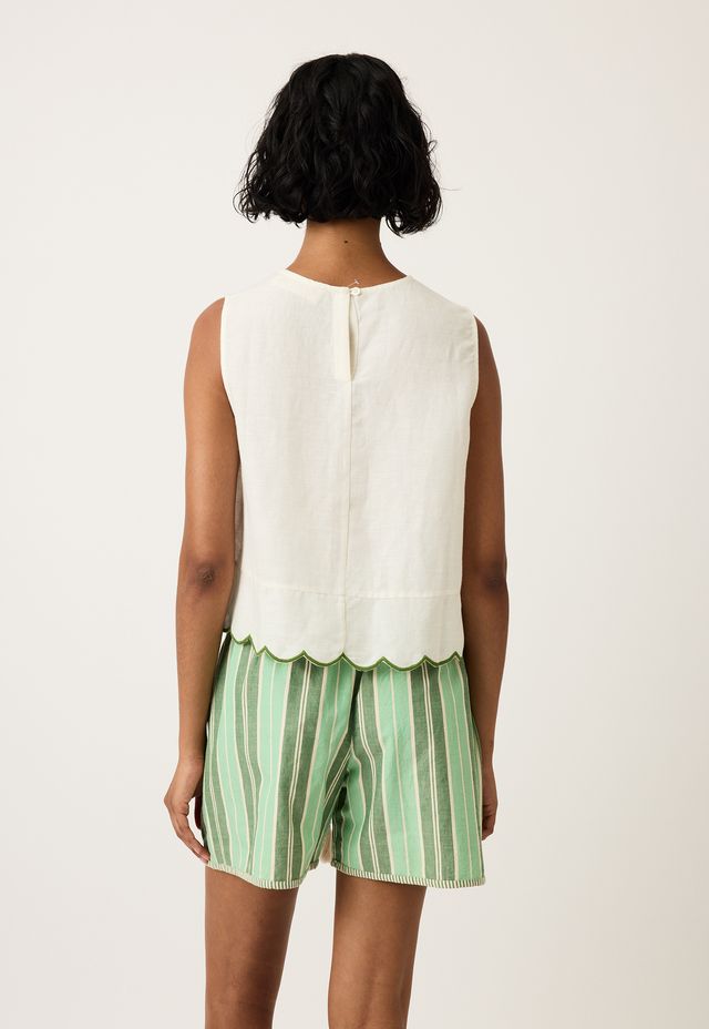 A relaxed crew neck top in cotton linen with scalloped detail at hem.