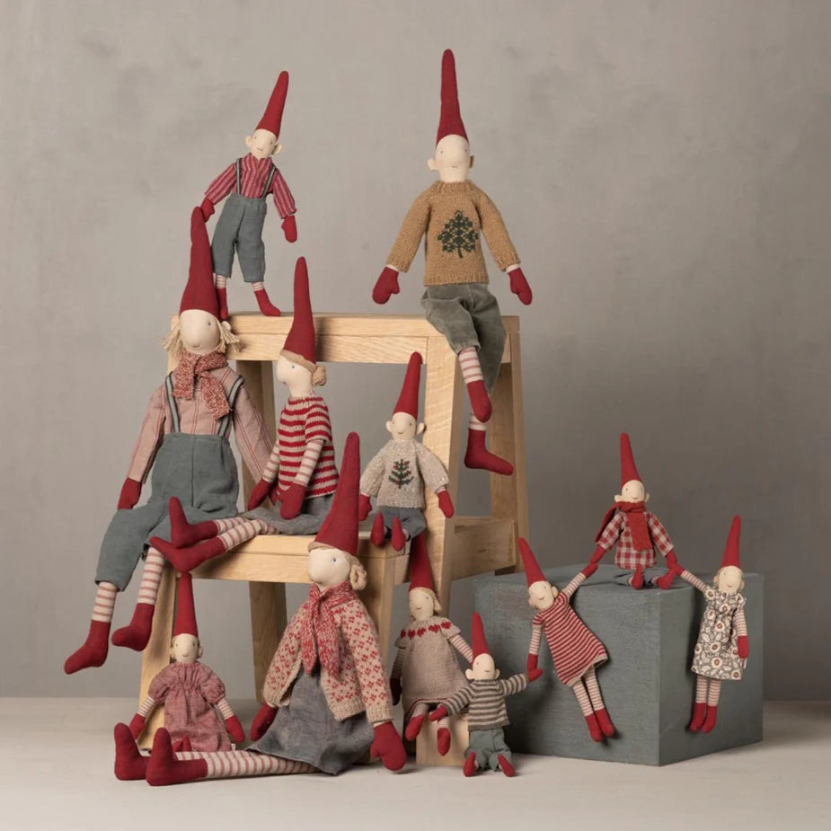 Welcome the magic of Christmas with the Maileg Pixy Size 4 Boy dressed in classic festive charm. Wearing a striped shirt, soft grey pants, a patterned scarf and signature red Pixy hat, he brings warmth and tradition to your holiday décor. With his tall, cuddly design and timeless Nordic style, this Pixy is perfect for display, cuddling or as a keepsake to treasure year after year.