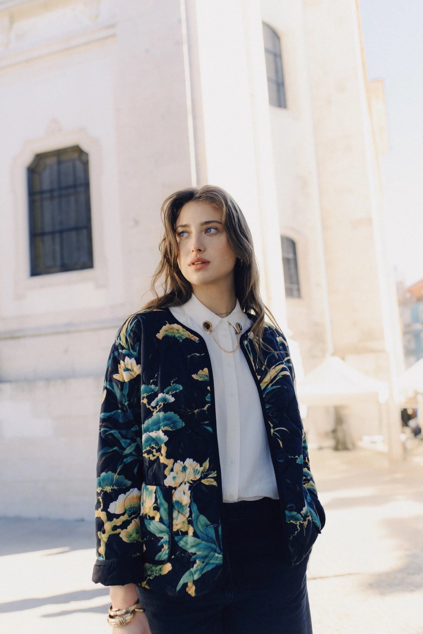 The Jiggy Jacket Neve is a sophisticated quilted piece crafted from woven viscose with a floral print. Featuring long sleeves, front pockets, and a button closure, this jacket combines refined style with practical details for a polished look.