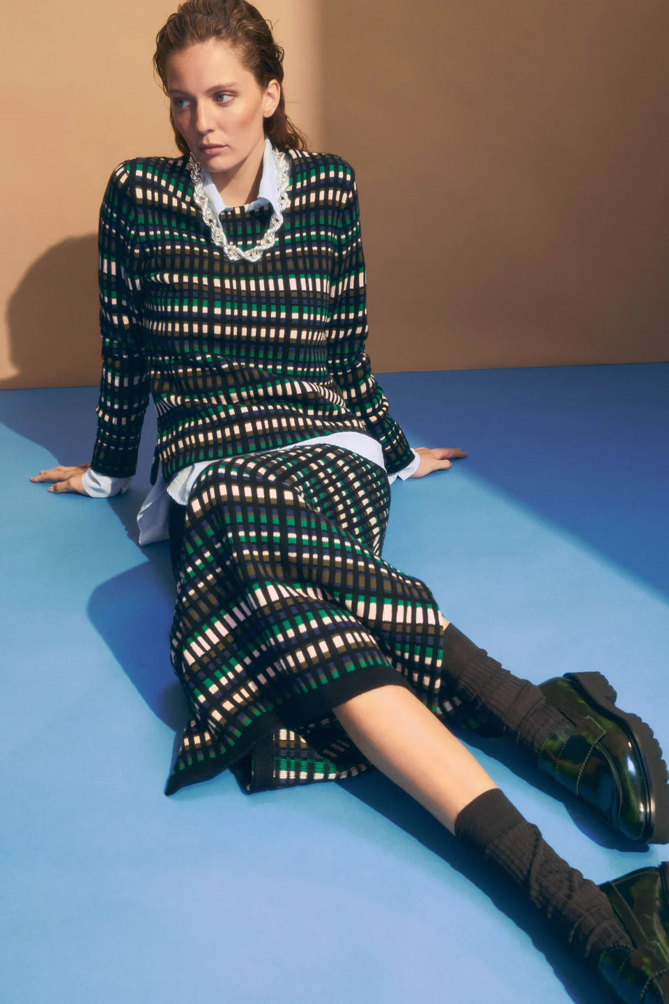 The Svea Organic Knit Sweater is a striking knitted pull-over, crafted from a soft organic cotton. This regular fit style features a crew-boat neckline, long set-in sleeves, and a mid-gauge knit construction in a graphical check pattern of steel blue, verdant green, cream and black. An ELK favourite shape with a streamlined slim silhouette and stretch from the knitted construction. A versatile sweater that pairs with the matching Svea Organic Knit Skirt for a fun statement look, or tailored trousers or denim for everyday wear when you want to add a pop of colour to your autumn-winter looks.